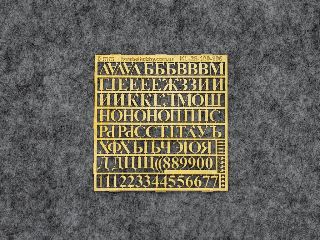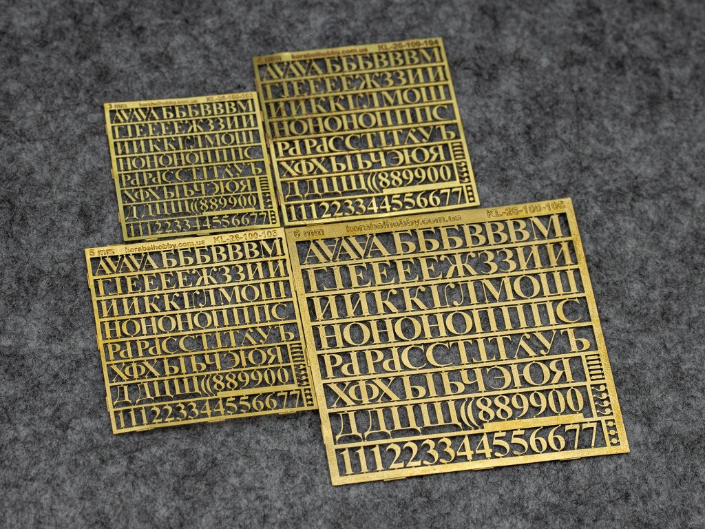 Набор из 67 букв алфавита-кириллица, 21 арабских цифры и 14 знаков препинания на одной пластине. Высота букв 6 мм.