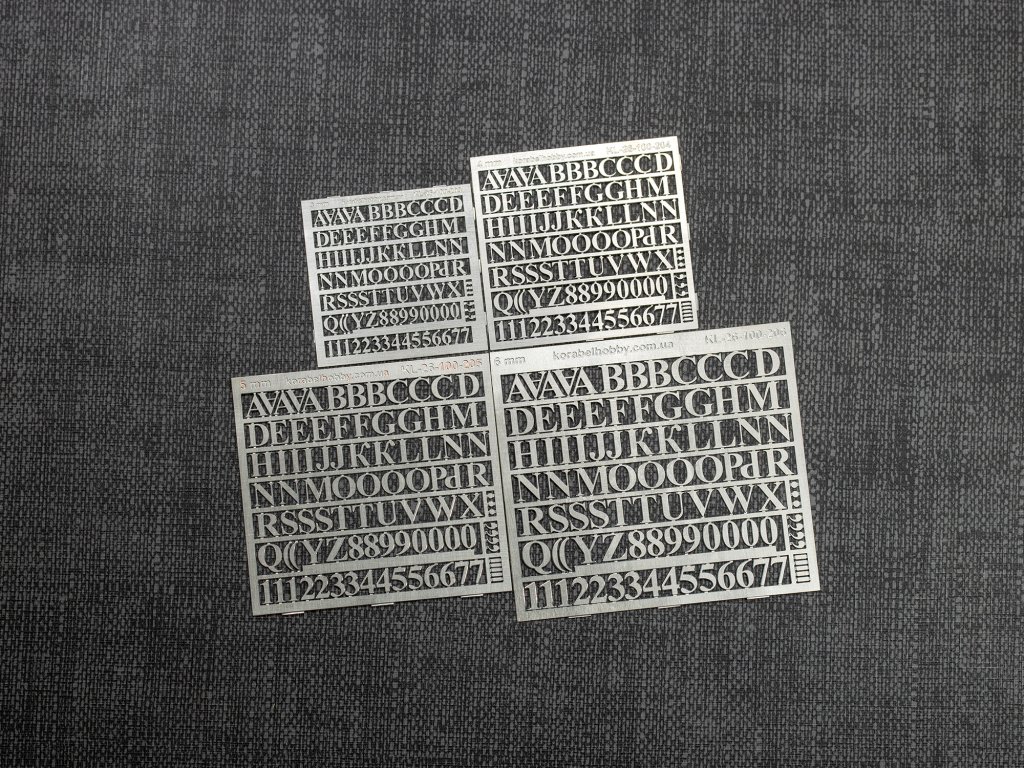 Пластина з 57 букв латинського алфавіту, 23 арабських цифр і 14 символів. Висота букв 4 мм. Виготоволені фототравленням з листа незильбера товщиною 0,3 мм.