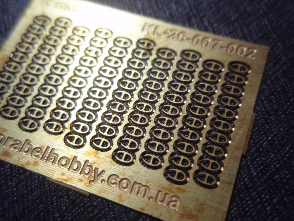 Это набор из 100 звеньев, выполненых с помощью фототравления. Цепь необходимо собрать самостоятельно, тяжело идут первые 5-7 звеньев, а потом как по маслу=). В каждом звене выполнен разрыв с одной стороны. В этот разрыв продевается второе звено, той частью где разрыва нет, после чего, разрыв сжимается и запаивается при необходимости.