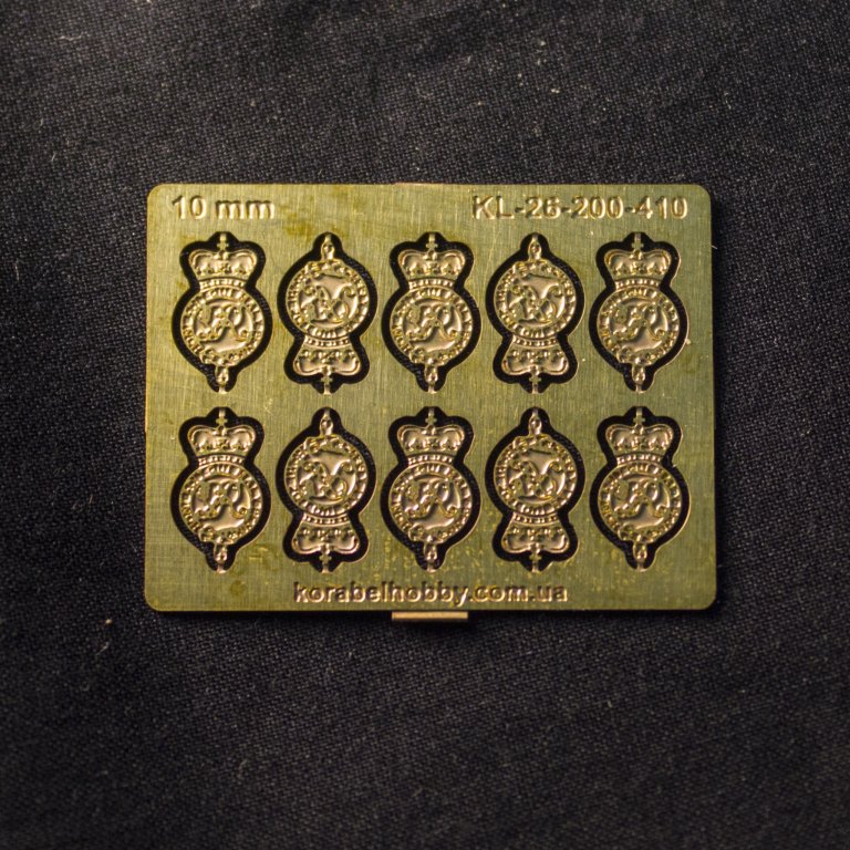 Травленый латунный декоративный элемент - большой (полный) герб Георга III. Может повсеместно использоваться для украшения моделей парусников Британского королевского флота.