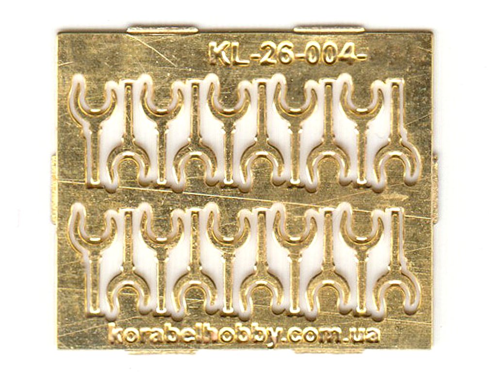 Миниатюрные травленые уключины для моделей гребных лодок вплоть до современных. Данная деталь используется на лодках/шлюпках, установленных на моделях парусников или отдельностоящих. Устанавливается в планширь или верхний торец борта. В уключину вкладывается древко весла и она формирует центр вращения для удобства гребли.