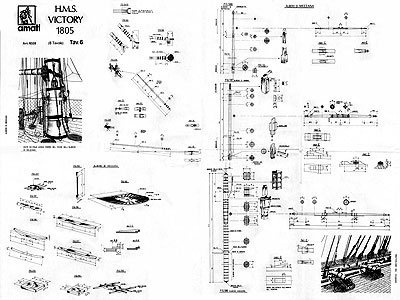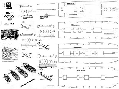 Набор чертежей корабля HMS Victory состоит из восьми листов формата 100х70 см. Чертежи выполнены в масштабе 1:100, длина получаемой модели около метра. Набор чертежей корабля содержит следующие виды: полноразмерный боковой чертеж с такелажем; выкройки шпангоутов и киля (фанера толщиной 5 мм); шлюпки (шпангоутные); рангоут с размерами; план укладки такелажа на палубе; стоящий такелаж; паруса; чертежи всех палуб. К чертежам прилагается сборочная инструкция. Пояснения на чертежах и в инструкции выполнены на итальянском языке. Приводится список необходимых реек и нитей.