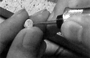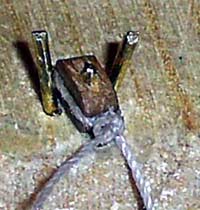 Обвязка миниатюрных блоков может представить некоторое затруднение. Надо, чтобы блок был доступен с трех сторон, и в то же время держался плотно на месте. Для этого я сделал мини-приспособление (см. фото). У края мягкой доски вбил три миниатюрных гвоздя без шляпок (средний короче, имеет высоту чуть больше толщины блока). Толщина гвоздей равна или меньше диаметра отверстий в блоке. Боковые гвозди не дают блоку прокручиваться при затягивании нити.