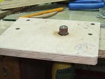 Как видно на фото - это наждачный круг от Dremel , зажатый в патрон сверлильного станка и кусок 10-ти мм фанеры, служащий упором...