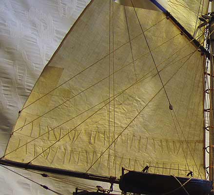 Далее необходимо заготовить материал для ликтроса и, если нужно, для риф-сезней. Все это выполняется в соответствии с масштабом из х/б нити с окрашиванием в том же растворе, что и парус, после чего пропитывается все в том же клее ПВА, разбавленном примерно 1:8 и сушится в натянутом состоянии. Пропитка не даст нитям раскрутиться и облегчит сборку. Ликтрос наклеивается клеем ПВА с помощью утюга постепенно, сторона за стороной. В местах, где должны быть кренгельсы, из ликтроса выпускается петелька. При приваривании ПВА утюгом получается очень прочное соединении, поэтому дополнительной фиксации не требуется . Клей необходимо наносить кисточкой очень аккуратно, чтобы после утюга не остались блестящие участки. Риф-сезни пропускаются в предварительно проколотые иголкой отверстия в риф-банте и фиксируются крошечной капелькой клея. После того, как весь риф-бант укомплектован, необходимо все риф-сезни повернуть в сторону нижней шкаторины зафиксировать утюгом и обрезать до нужной длины. Парус готов!