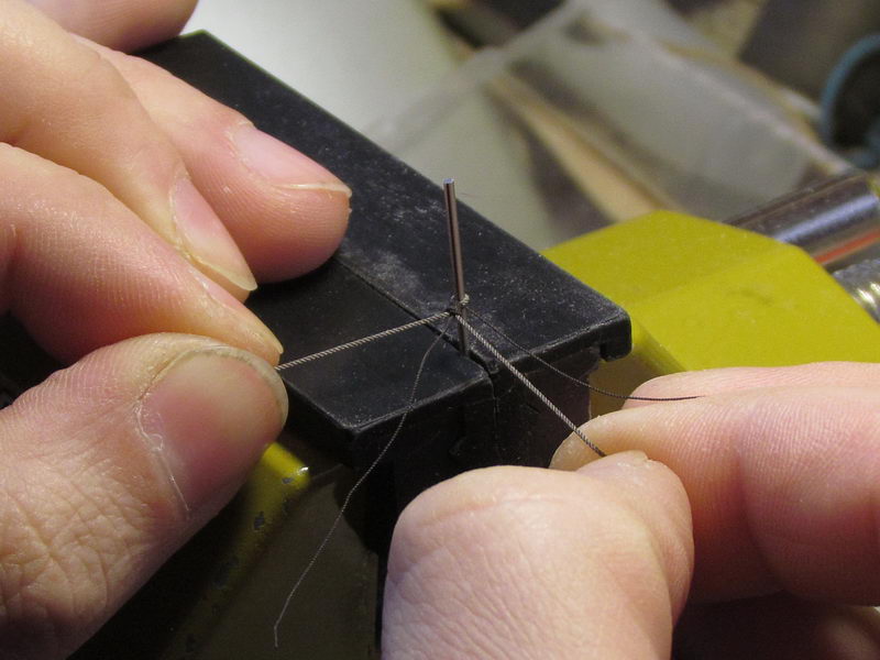 Итак, для обвязки взят блок 5 мм, строп 0,5 мм, нить для бензеля 0,25 мм (толщину и цвета нитей взял навскидку, то, что под рукой было, для технологии обвязки это значения не имеет, блок 5 мм взят для наглядности, я так обвязываю весь размерный диапазон блоков).
