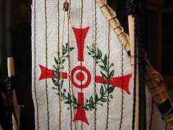 - Поочередно наносим разной краской слои: красный (крест) и зеленый (оливковый венец) зеленой краской. Каждый слой наносится только после высыхания предыдущего. Контуром нанесена позолота.