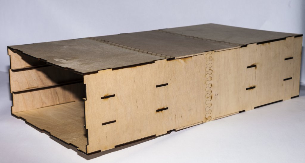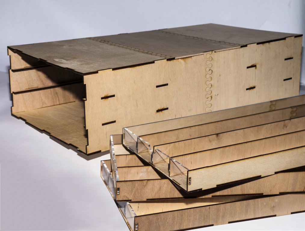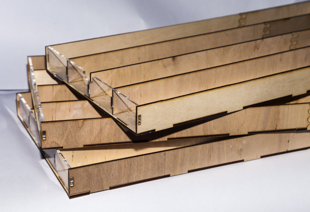 Классический органайзер с длинными ячейками для реек длиной до 590 мм. Имеет три ящика по 4 ячейки в каждом. Создан специально для хранения реек, круглых заготовок и нешироких листов. Вы можете разложить материалы по размеру или по типу дерева, как удобнее. Внешняя сторона всех ящиков сделана из прозрачного оргстекла, так что содержимое не будет для вас секретом. Стенки модуля и ящиков сделаны из фанеры.