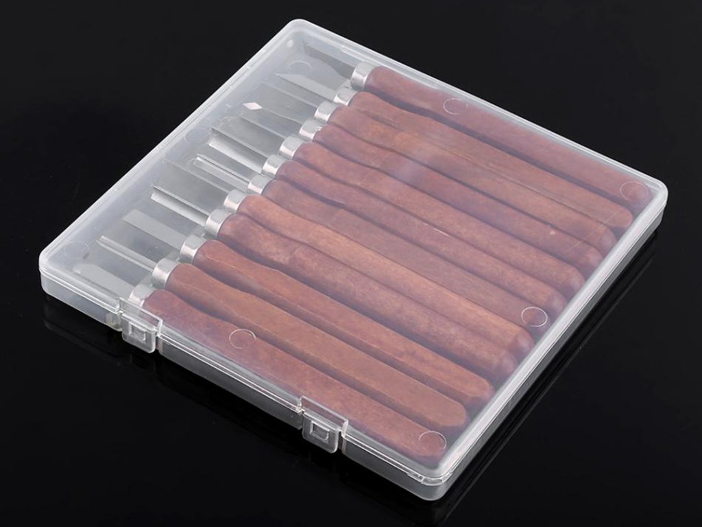Резцы предназначены для ручной резьбы по дереву. В набор входит 12 резцов с различной формой режущей части: плоской, скошенной, полукруглой и V-образной. Данный набор отличается повышенным качеством режущей стали и ручки в отличии от более дешевого аналога у нас на сайте. Поставляются в пластиковой коробочке, что удобноь для хранения. Деревянные ручки, в которых зафиксированы несъемные лезвия. Полная длина инструментов около 140 мм. Стамески требуют тонкой финишной заточки/доводки для максимально комфортной работы.