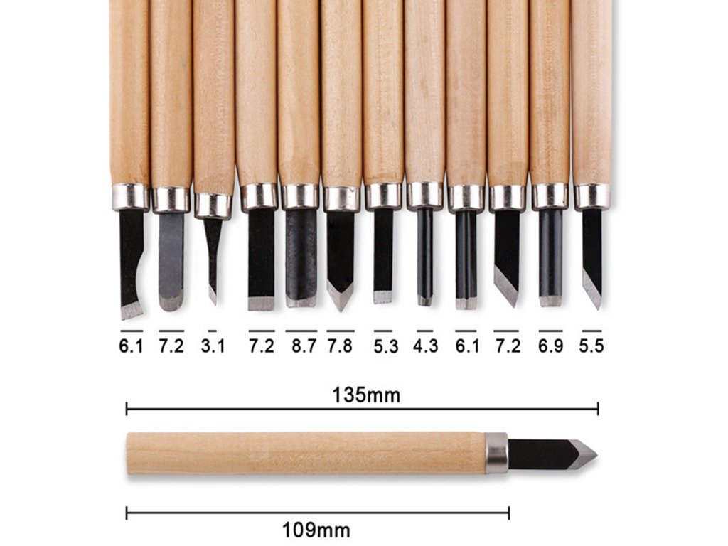 Резцы предназначены для ручной резьбы по дереву. В набор входит 12 резцов с различной формой режущей части: плоской, скошенной, полукруглой и V-образной. Данный набор отличается сниженным качеством режущей стали и рукояток в отличии от более дорогого аналога у нас на сайте. Деревянные ручки, в которых зафиксированы несъемные лезвия. Полная длина инструментов около 140 мм. Стамески требуют тонкой финишной заточки/доводки для максимально комфортной работы.